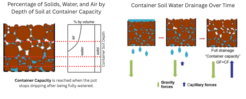 When a fully watered container stops dripping, it has reached container capacity, and the pore spaces in the soil at the bottom of the pot are filled with water. Container capacity is a property of the soil and does not change unless the soil recipe changes. The saturated soil is a consistent height regardless of container width or depth. A soil that holds less water at container capacity than another will dry faster, with all other variables held equal.